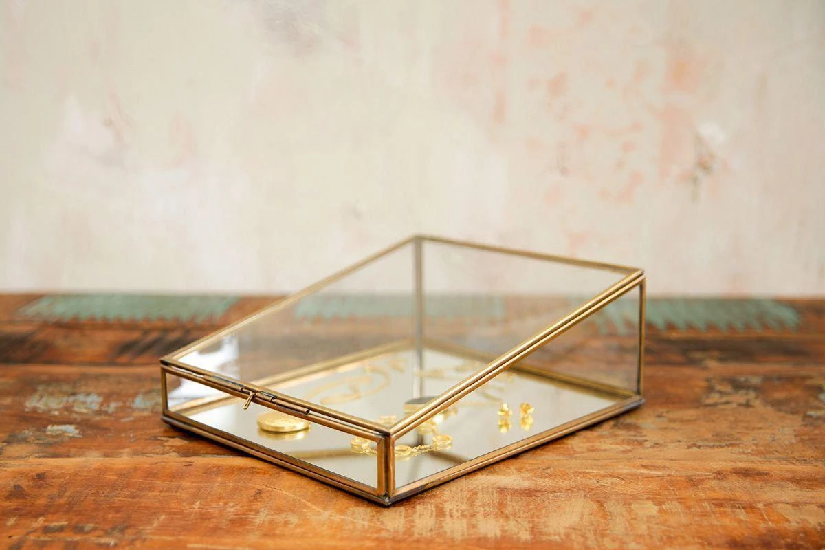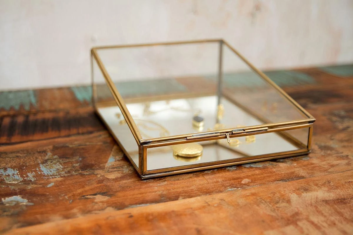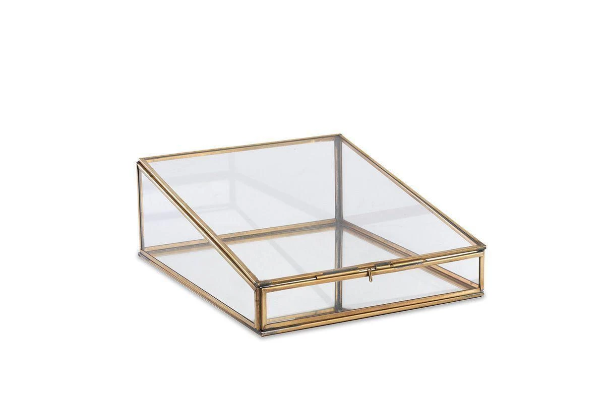 This display box in glass and antique brass has been designed with a slant to perfectly showcase the items within.