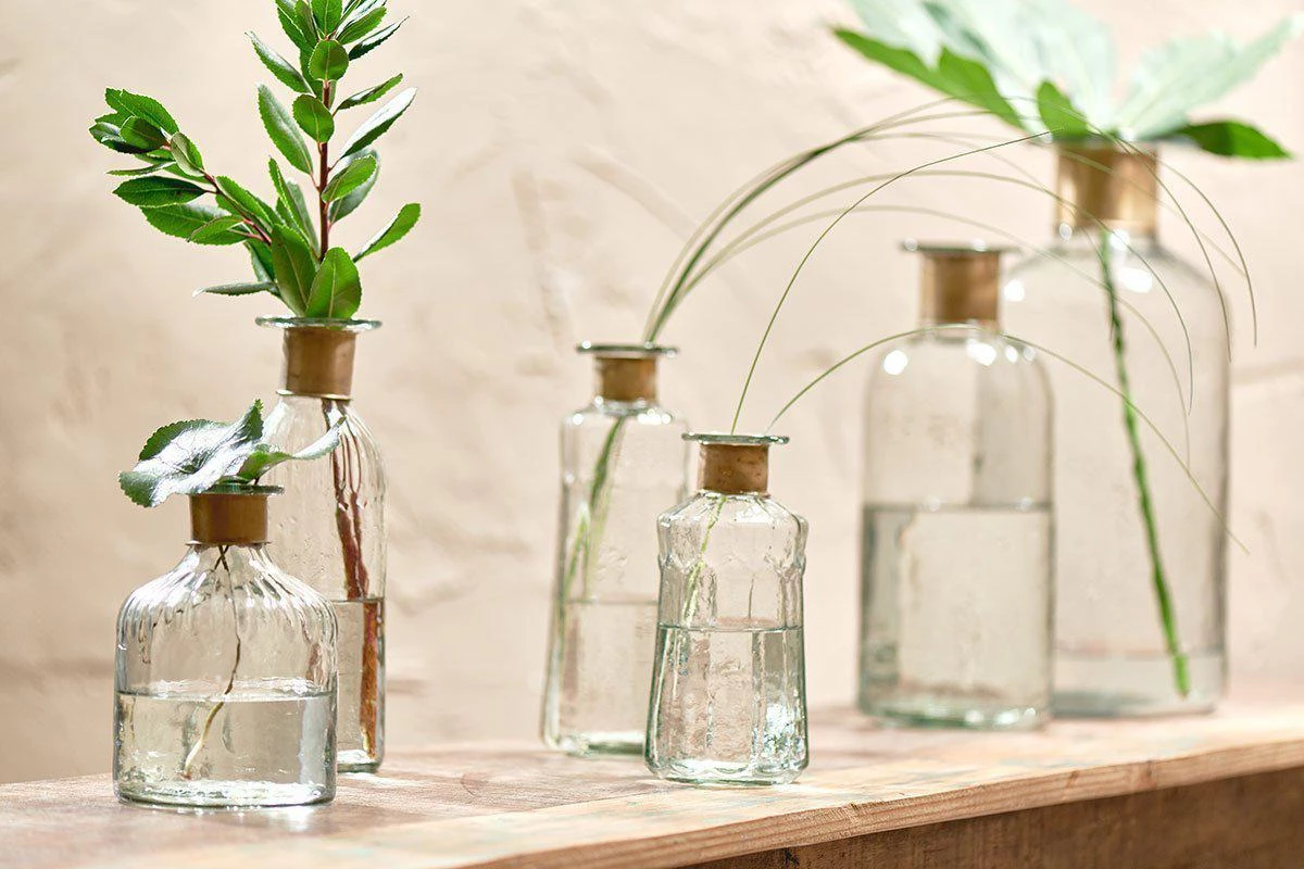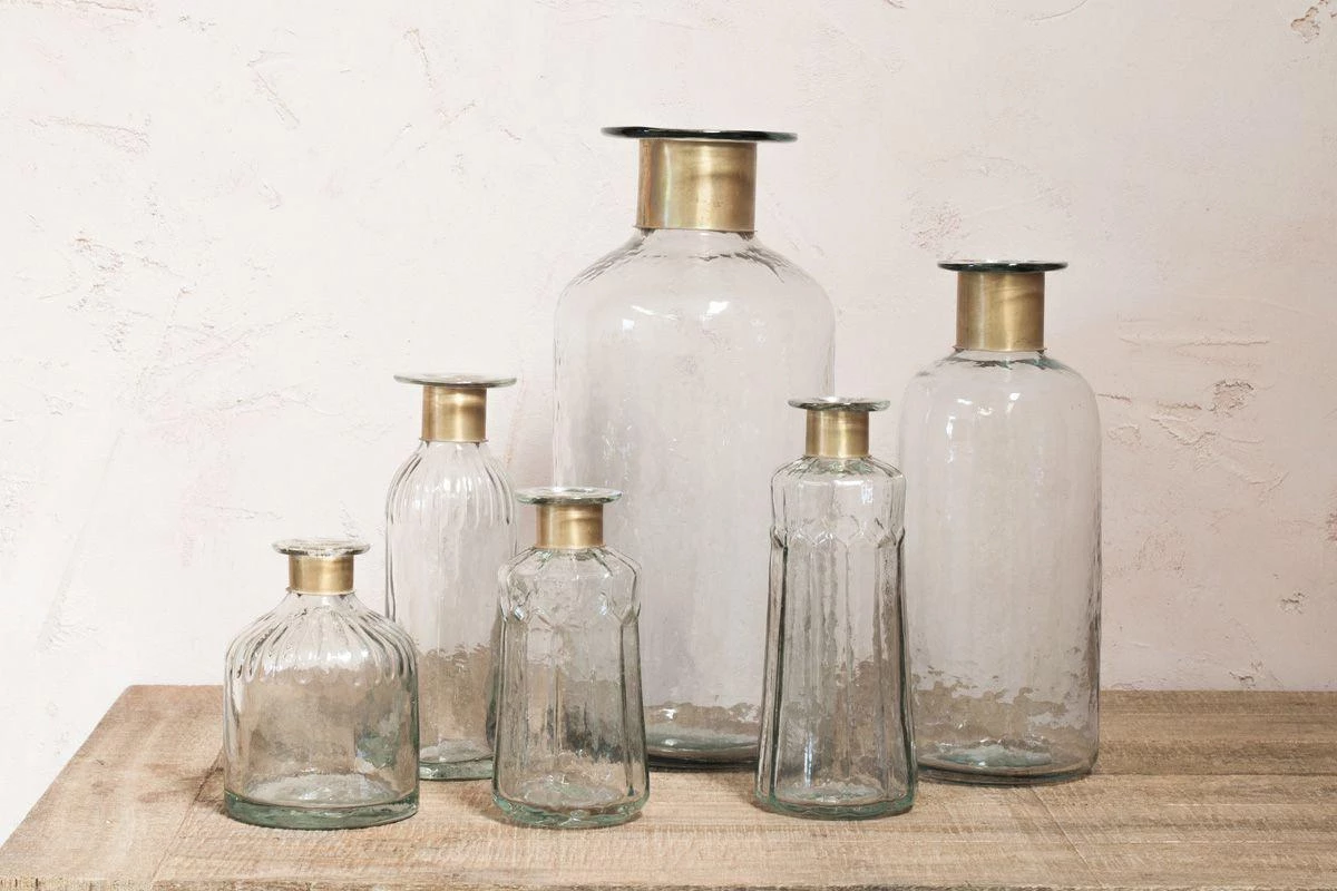 These stylish bottles have a hammered glass finish which adds depth and character. The neck is dressed with a brass ring that adds to the elegance of the piece.