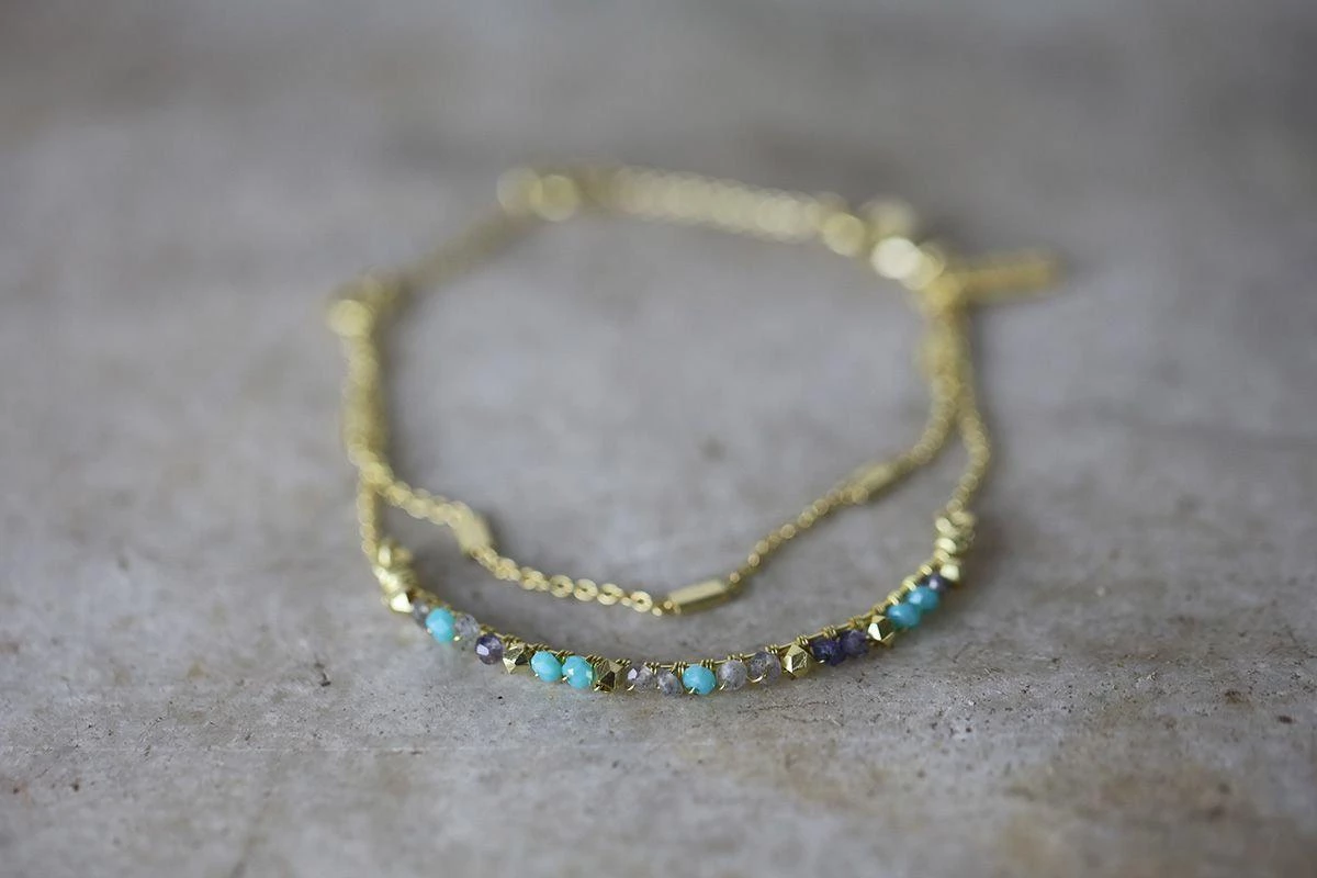 This stunning gold bracelet has a striking beadwork design made from natural stones in aqua shades.