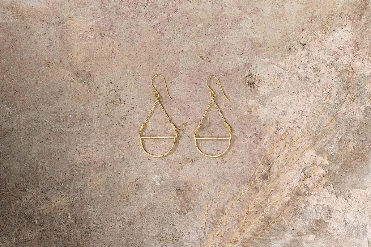 These elegant Nuba earrings are beautifully hand crafted. The bar and semi-circle have an eye-catching hammered detail, joined to a short chain of individual, hand shaped gold beads and adorned with two natural Prehnite stones. The earrings hang perfectly and are ideal for day and evening wear.