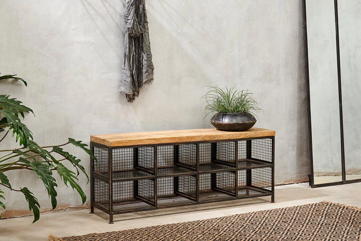 This industrial mesh storage bench has eight useful compartments, ideal for keeping shoes and other items tidied away. The practical bench has a chunky natural wood bench seat.