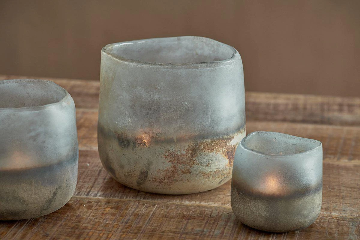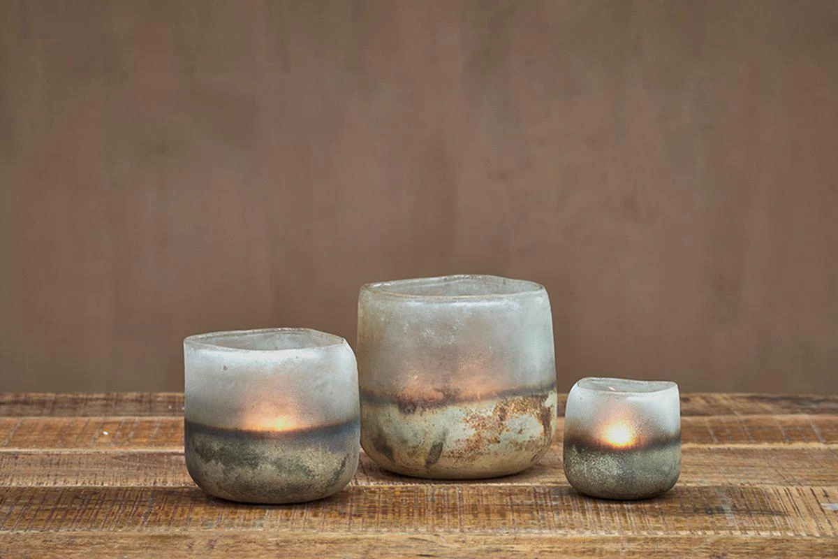 The smoky hues of our Ngola t lights are crafted from recycled glass material and skilfully shaped in this organic design. The soft hues, lit by candlelight produce a soft, atmospheric light.