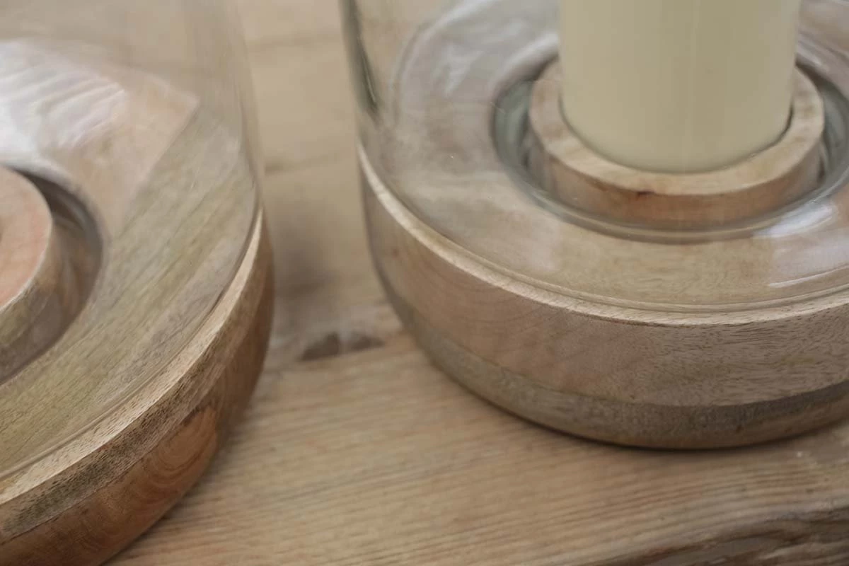 This small hurricane lantern has a tapered glass dome sitting atop a simple, sustainable mango wood base.