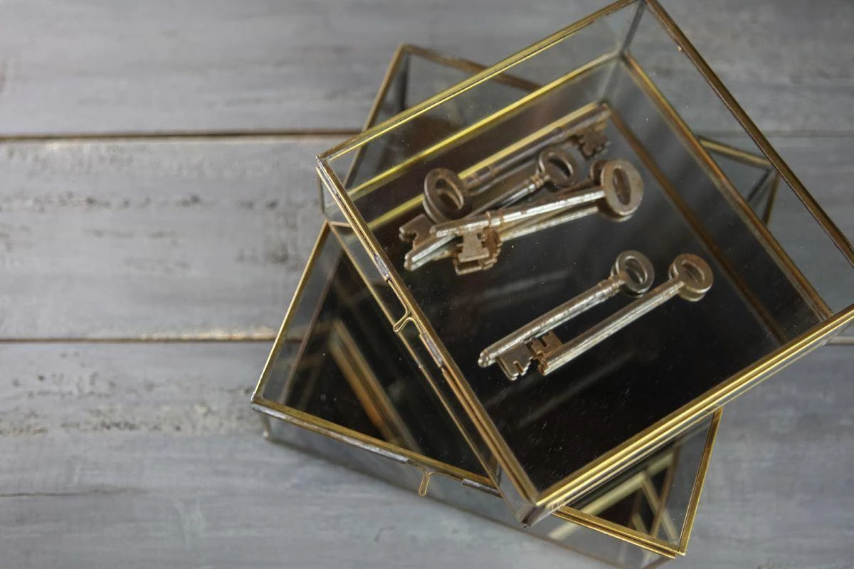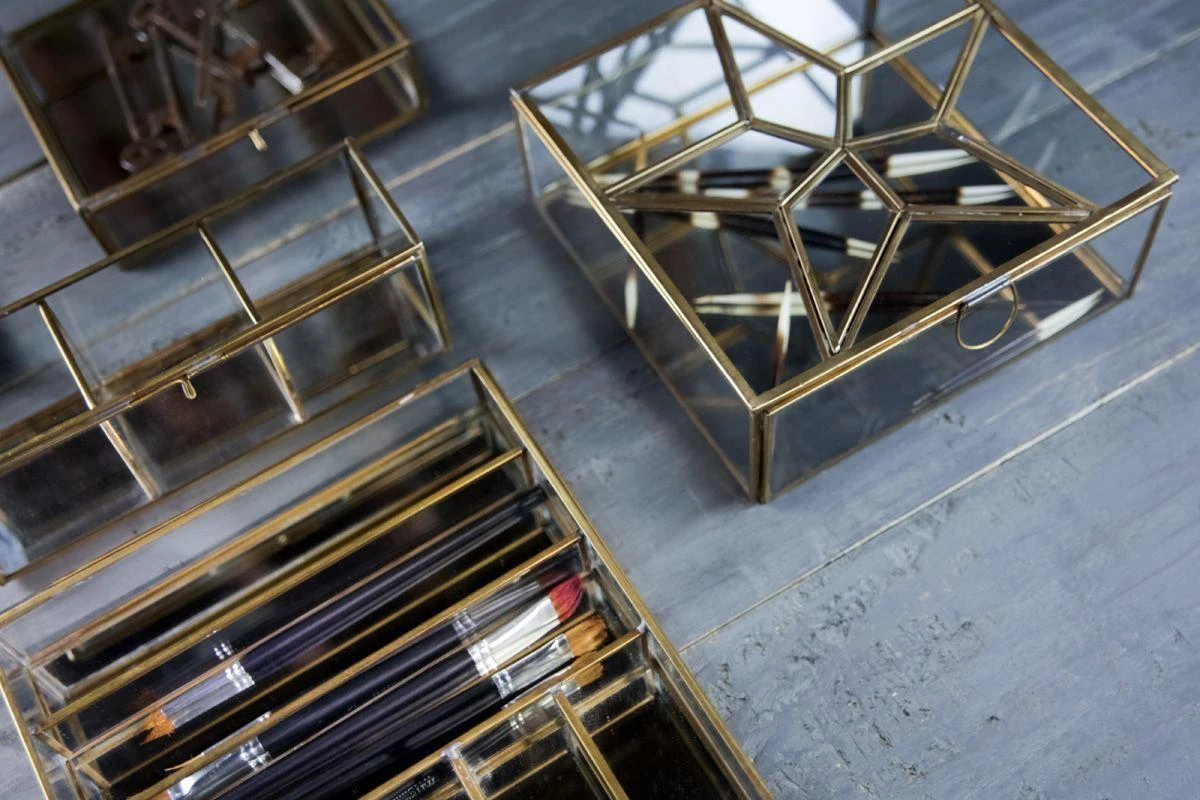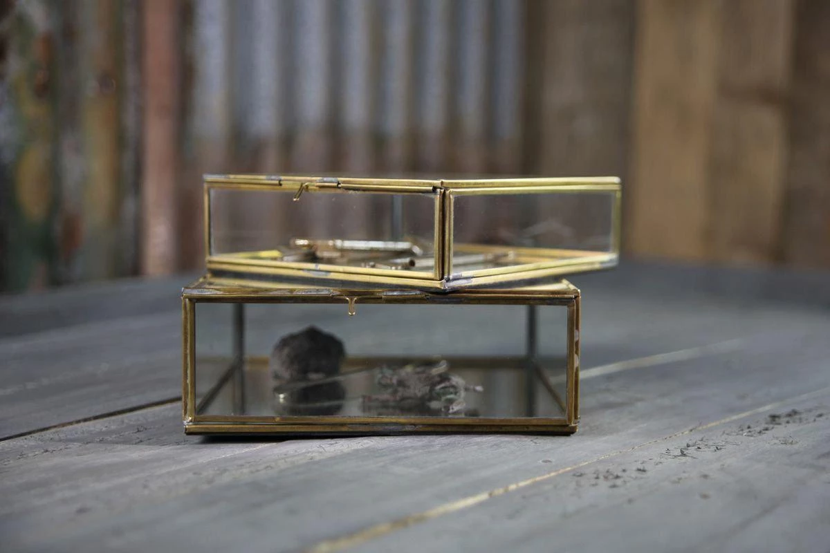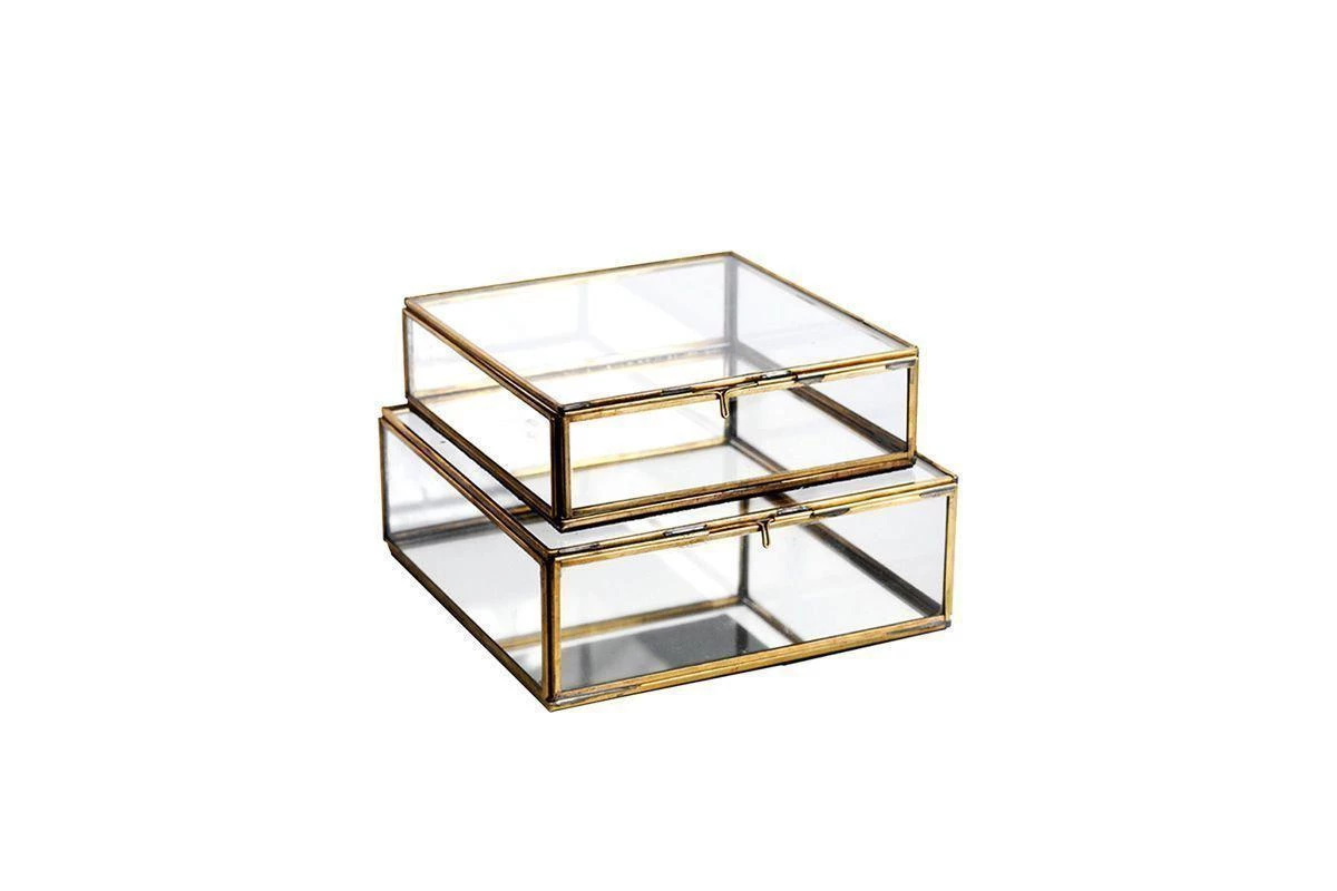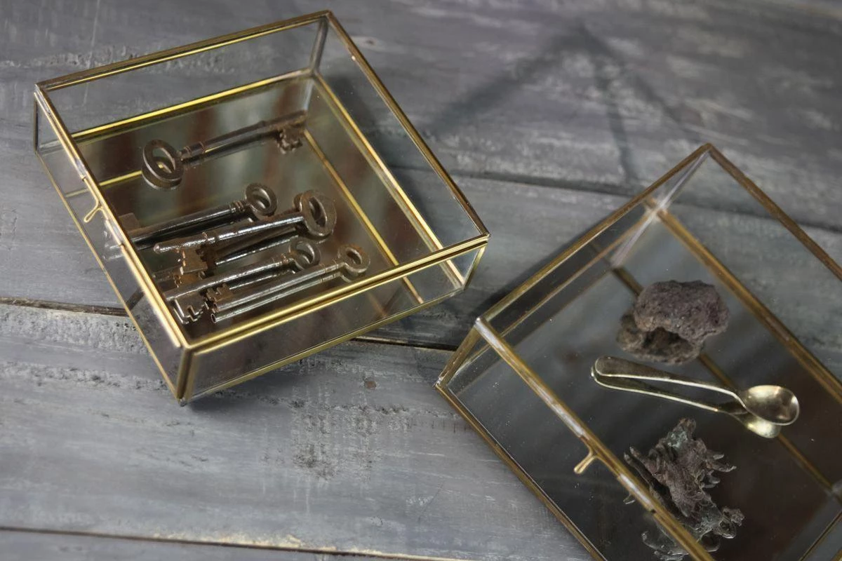 Organise your bits and bobs in these lovely glass storage boxes. Each one is handmade with a gorgeous antique brass edge, a mirrored base and has a quirky, vintage feel. Available in a choice of small or large box.