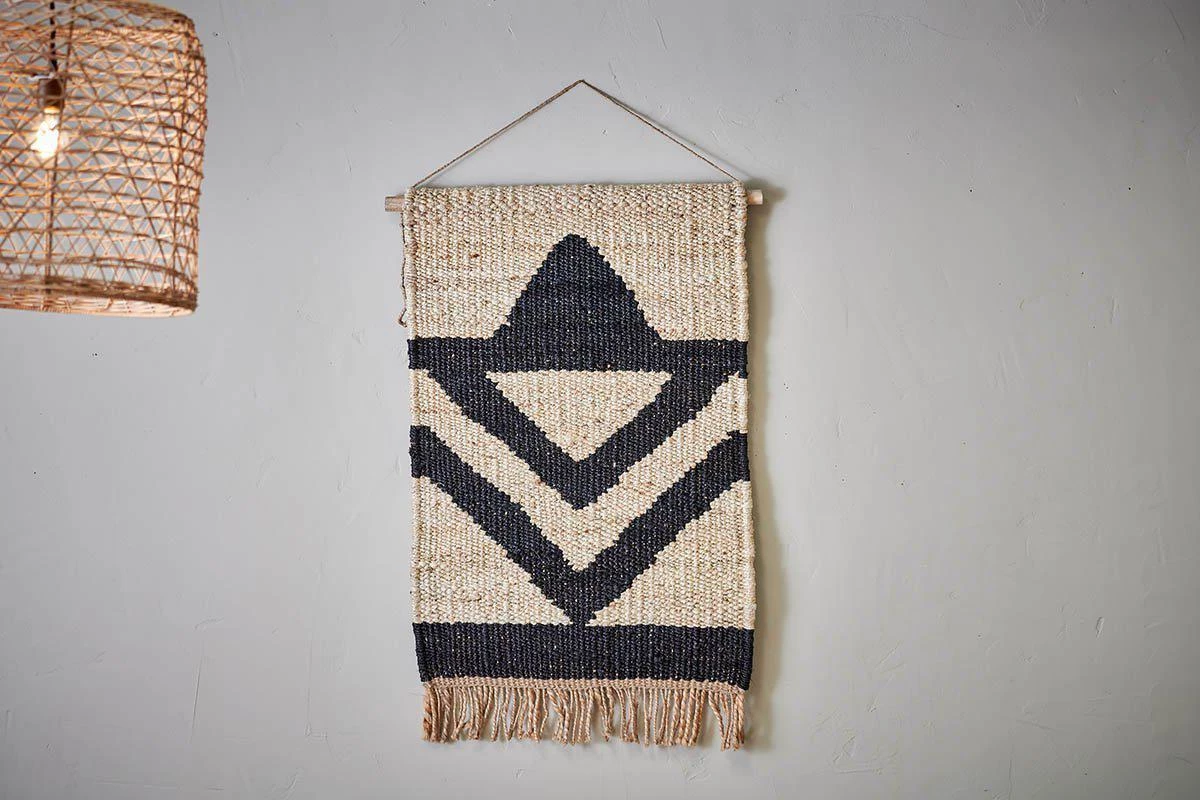These handwoven wall hangings have a solid wood bar and hessian hanging tie.