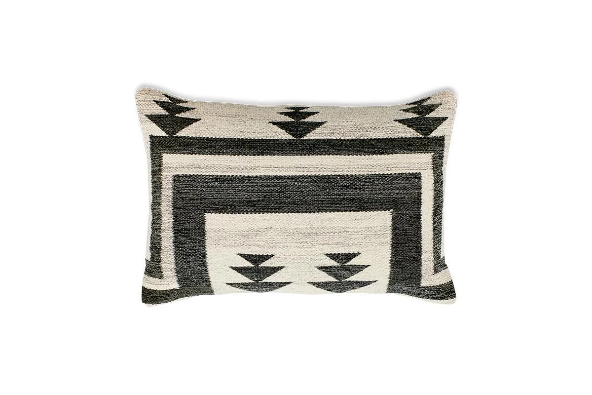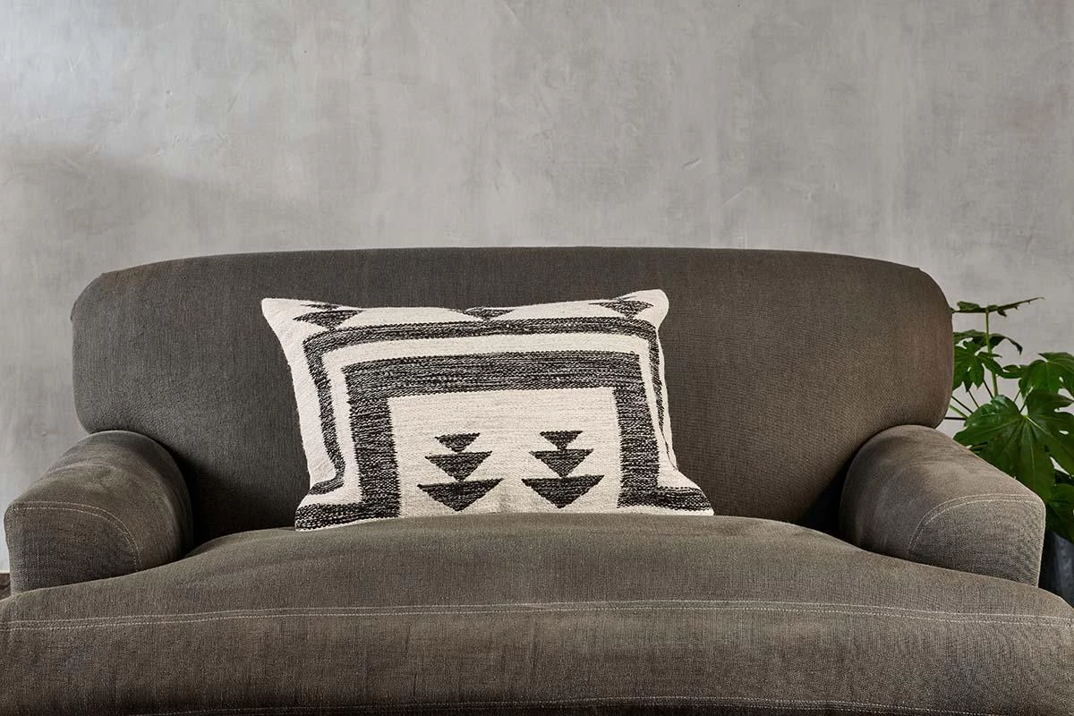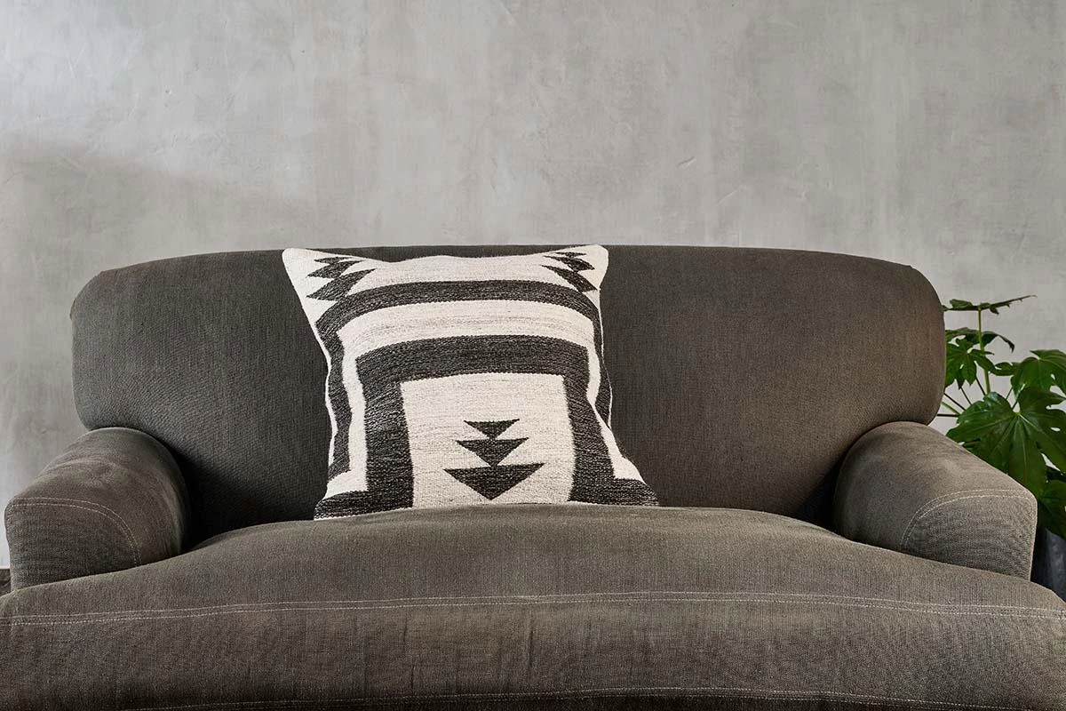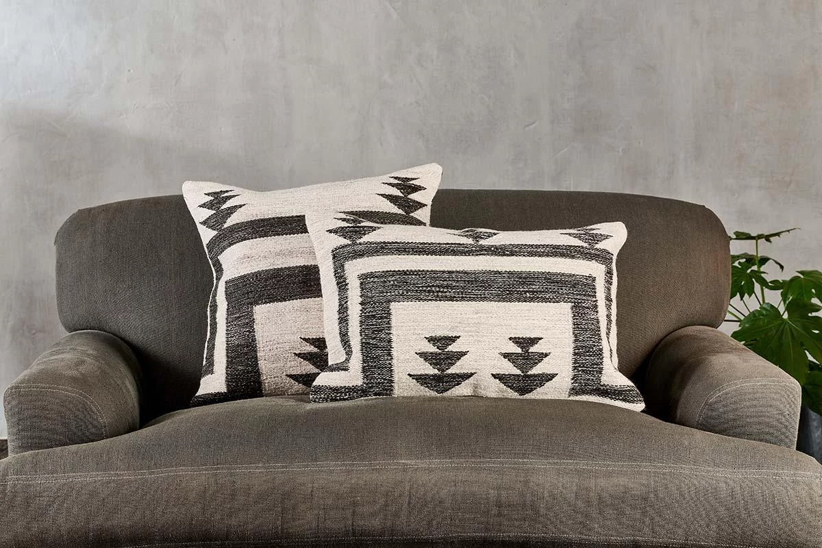 The striking geometric pattern of our Mahina cushion cover is skilfully made from recycled PET plastic. The material is tactile and practical, the yarns are skilfully woven in a traditional way, to create this eye – catching pattern. The reverse of the cushion is made from canvas.
