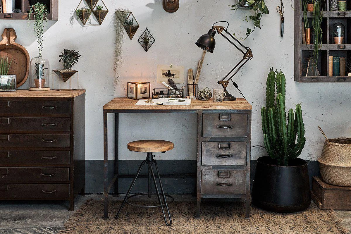 This timeless desk combines three metal drawers with a distressed black iron frame and a sustainable mango wood top.