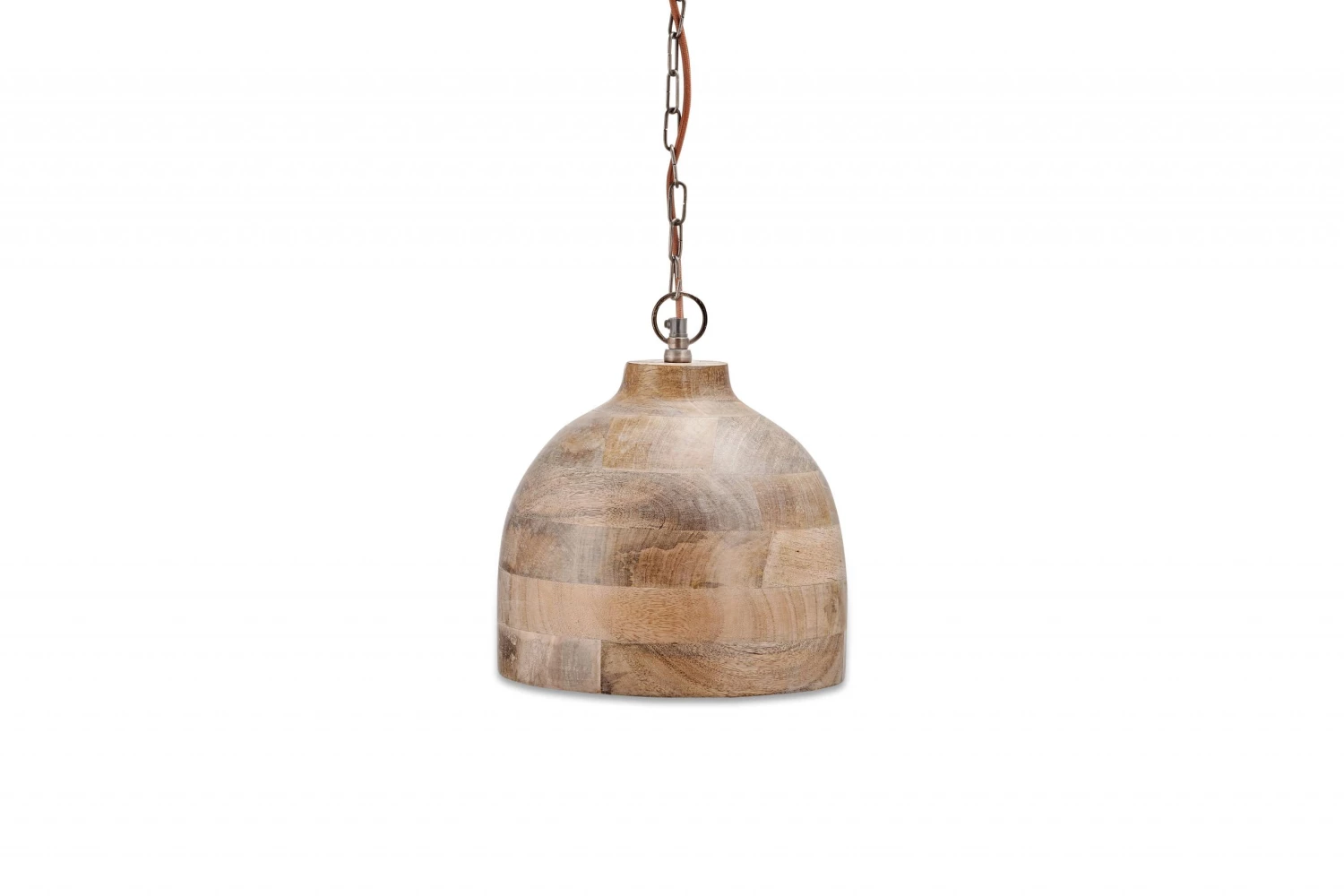 This pendant light is made from sustainable mango wood. The accompanying cord is brown fabric and the ceiling rose has a brushed metal finish. E27 Light Fitting.