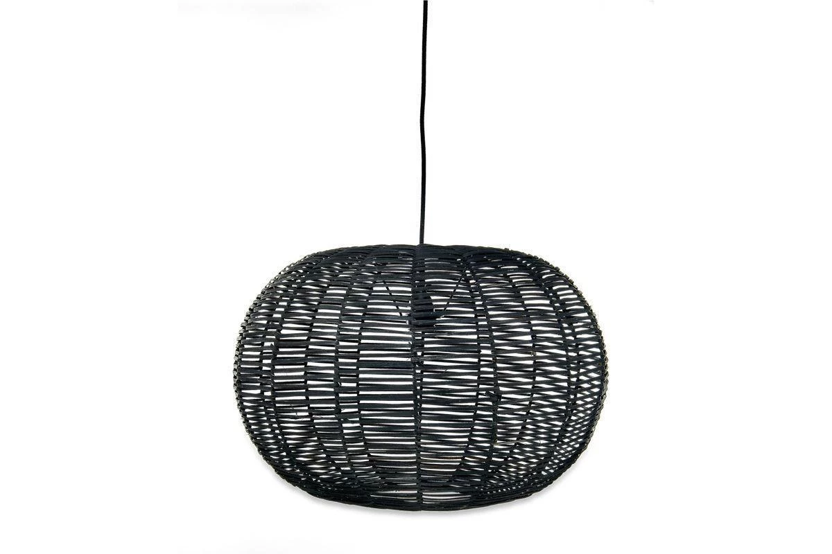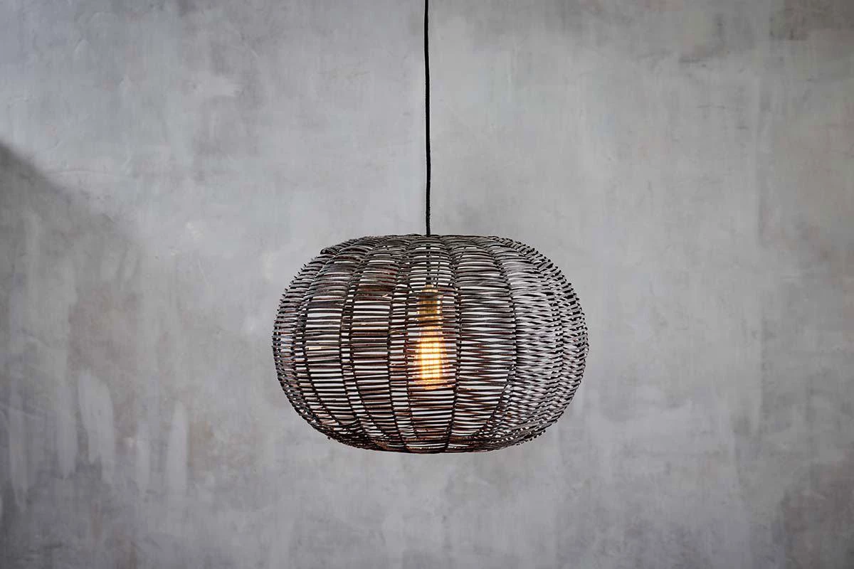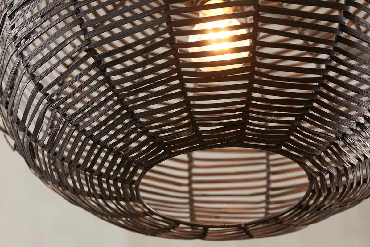 This spherical black wicker pendant-light is a well-designed and striking focal point. The Nordic style lampshade is finished with a black fabric cord (1.5m) and brass ceiling rose (14cm dia)