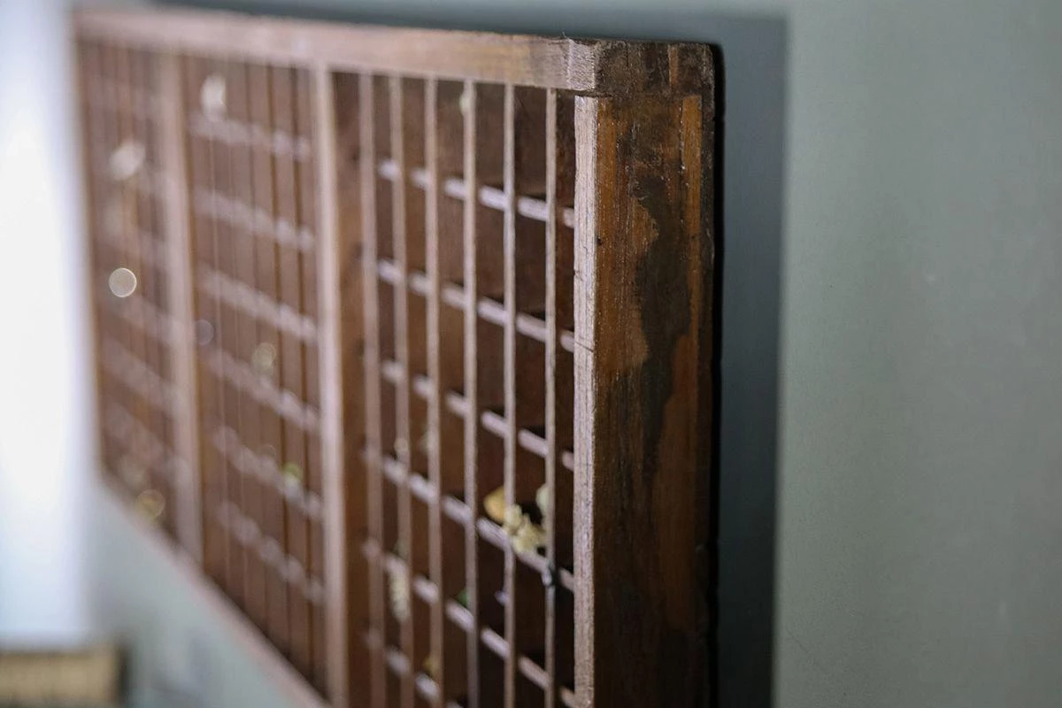 We carefully curate our reclaimed pieces in India. The many squares of these reclaimed printers drawers vary in size, originally handmade for letter blocks the drawers are made from a dark wood.