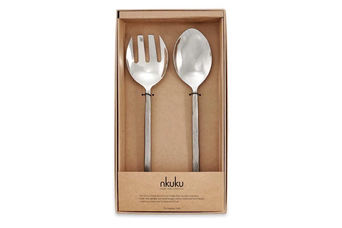 These brushed silver salad servers have hand forged handles that wrap around a stainless steel serving spoon and fork. A great addition to the table.