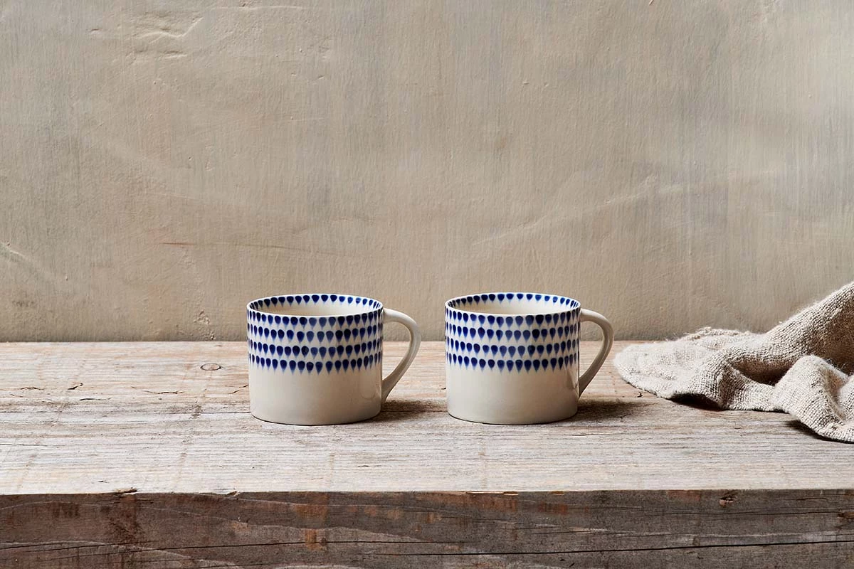 These perfectly proportioned coffee mugs are hand painted with a stunning indigo drop design. The pattern features around the lip of the mug and contrast perfectly against the off-white glaze.