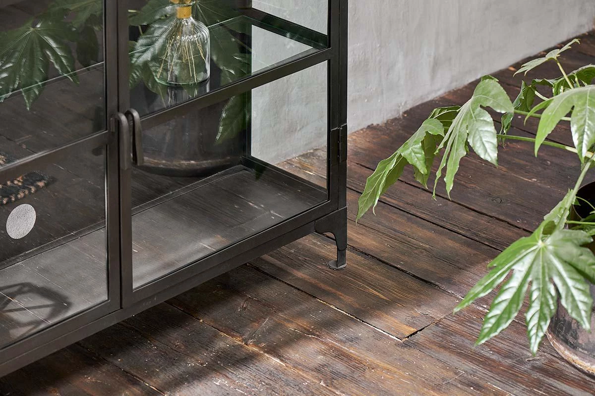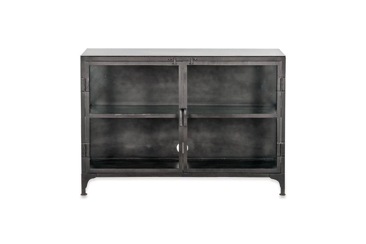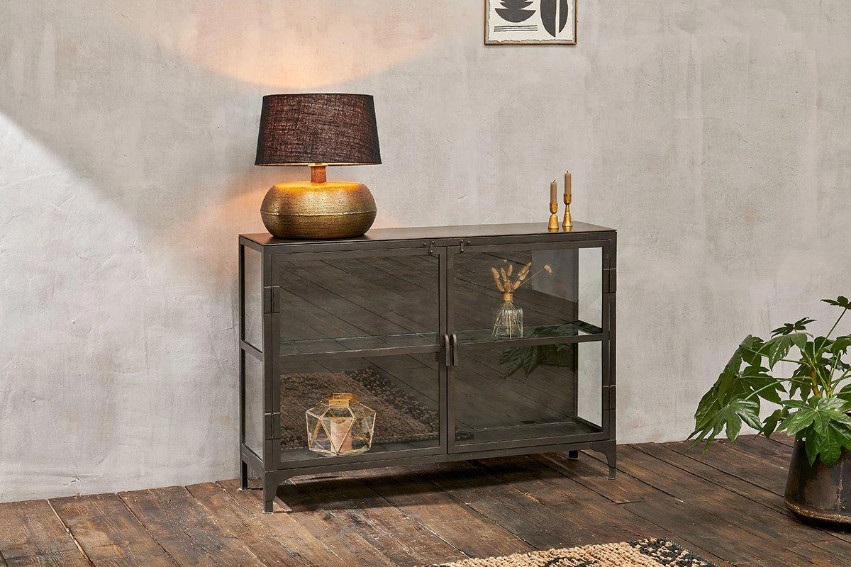 This perfectly proportioned Tiko sideboard has a striking design, the four clear glass front panels are stylishly framed by a solid iron band. This timeless piece works well as a conventional sideboard but has also been designed as a practical home entertainment console with a discrete access point for cables and plugs.