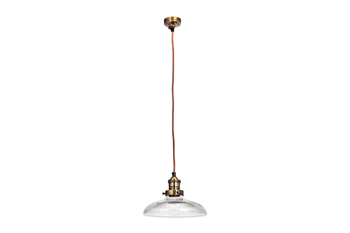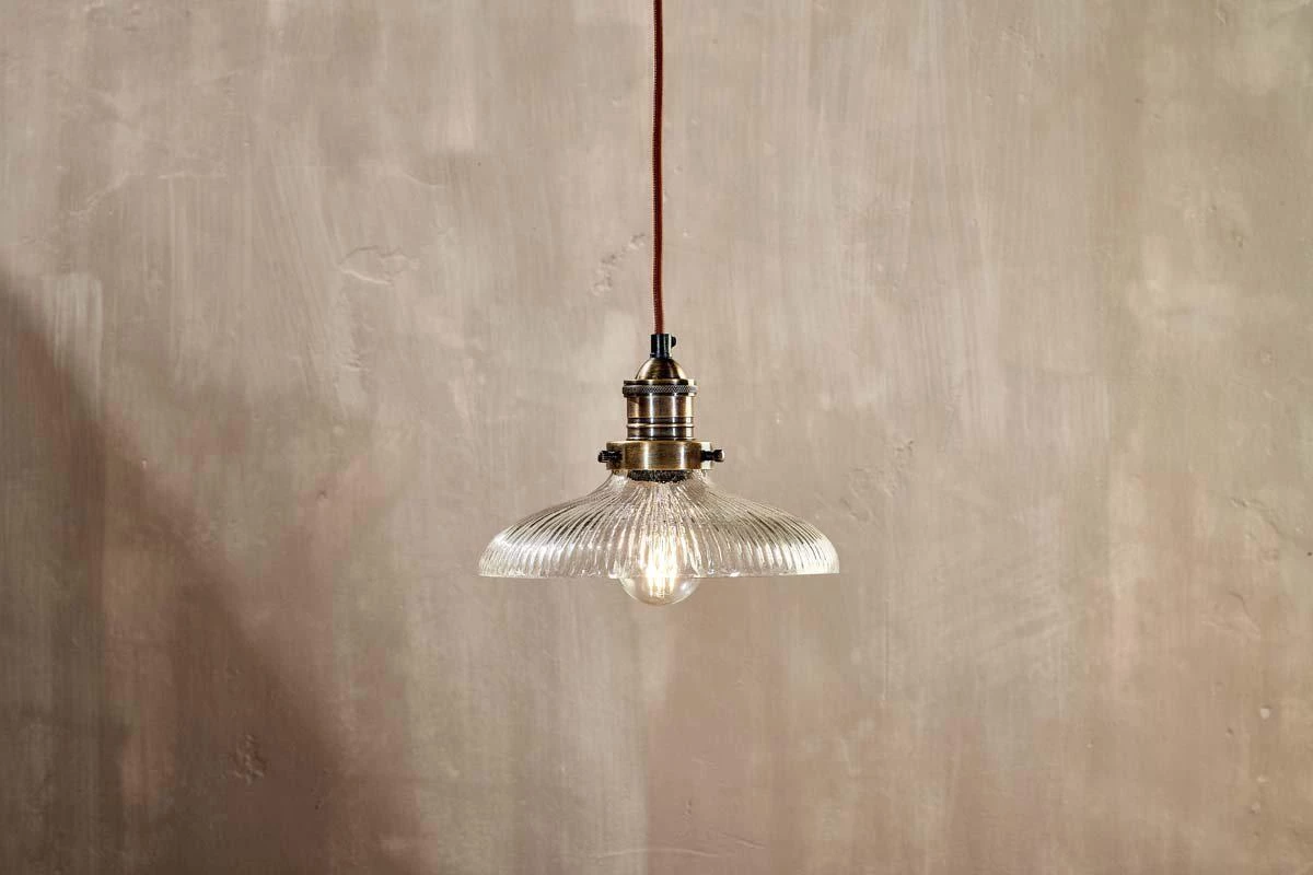 The small Zowie Pendant Light has a timeless elegance. The ribbed detailing of the glass shade, not only adds an attractive design detail but helps diffuse the light. The shallow lampshade design makes it ideal for displaying over a table, singularly or in a rows of three for real impact. The Zowie Pendant marries brass and glass in a timeless design.